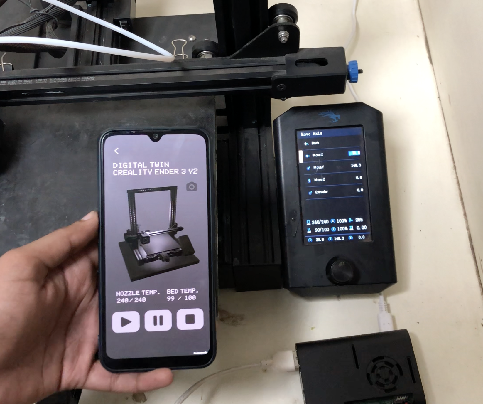 The Unity application served as the interface, translating this data into a comprehensive, real-time 3D model of the printing process. This allowed for interactive monitoring and control, significantly enhancing user interactions and operational efficiency.